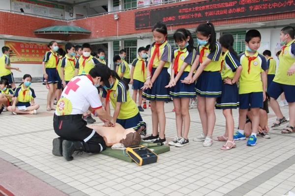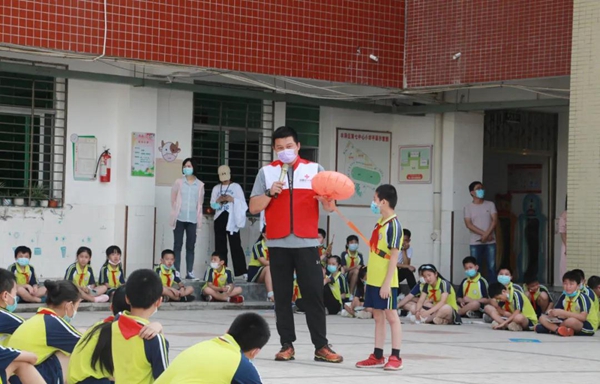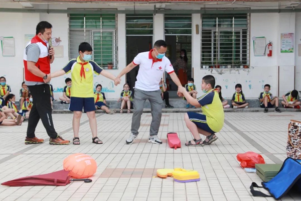 现场模拟演示救生用品和漂浮物的使用 “自己遭遇涉水意外,该怎么自救?发现溺水者,又该如何正确施救?怎样进行正确的心肺复苏?……” 3日上午,一场以“水上安全教育及现场应急救护知识进学校活动”为主题的培训在丰泽区第七中心小学的操场上拉开序幕。该校四、五年段学生及部分班主任和体育老师共300多人参加。 活动由区卫生健康局、区红十字会、区教育局、清源街道办事处主办,区第七中心小学、区清源社区卫生服务中心协办,采取“现场讲解与模拟操作演示、学生现场互动参与相结合”的形式开展。 “水上安全知识进校园一直是丰泽区红十字会重要的品牌活动,我们也一直在持续推进这项工作。”丰泽区红十字会工作人员黄芷静介绍活动举办的初衷,“炎炎夏日,很多小朋友会到游泳池,甚至到河边游泳。为了避免溺水等事件的发生,最大限度减少不必要的伤亡,增强他们珍爱生命的意识,我们邀请了省红十字水上救援队的老师来为孩子们讲解授课。” 夏季,不少人喜欢参加亲水活动,但这也是溺水事故的多发期。在活动现场,福建省红十字水上救援队白纬锋现场授课,着重讲解了“如何预防中小学生溺水”“发生溺水突发情况时现场施救方法”等知识,并现场邀请学生上台,模拟演示救生用品的使用、施救溺水者的技巧等;接着,福建省红十字水上救援队吴兰兰亲身示范对获救溺水者实施心肺复苏术的要点等院前现场急救方法,在吴兰兰老师的指导下,孩子们兴致浓厚地亲身体验心肺复苏施救方法。现场还有区清源社区卫生服务中心工作人员给孩子们模拟“120急救人员到达现场,受救人员被安全移送”等疫情防控相关知识。经过本次理论培训,不但开拓了孩子们的视野,提高其理论知识,还增强了救生技能。 “在这场活动中,我学到了心肺复苏,也明白了,当别人溺水时,该如何正确进行施救。”丰泽区第七中心小学五年级学生谢晨希在培训后说道,“活动结束后,我可以通过上网搜索,查找一些相关的图片或视频,将今天学到的知识分享给身边更多的人。”