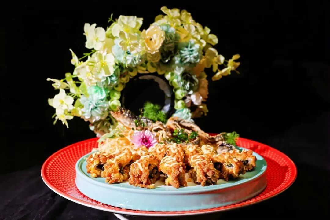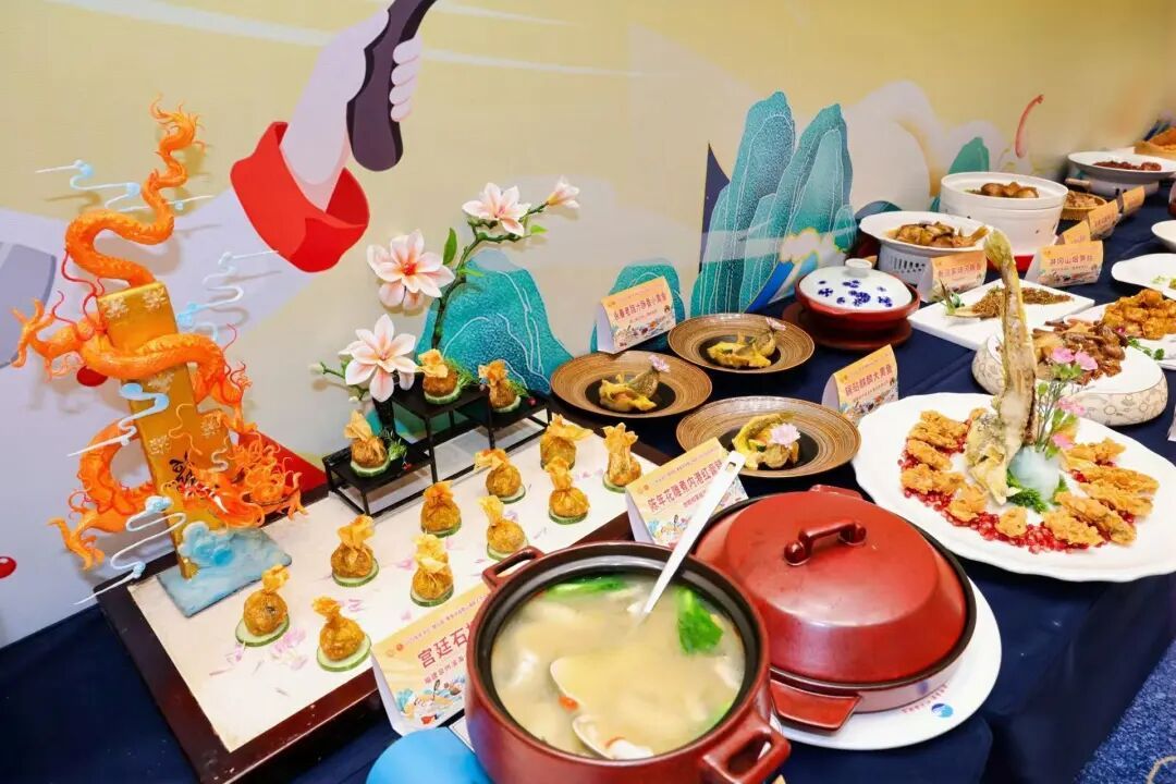 晚宴上菜秀 颁奖仪式结束后,泉州滨海大酒店团队身着簪花服装带来“上菜秀”,现场展示部分获奖菜品,工作人员同步讲解每道菜品的食材选择、烹饪技法及“簪花筵”文化内涵,让嘉宾在视觉与听觉的双重体验中,感受美食背后的文化底蕴。随后,大会在乐队演唱、闽南传统舞蹈《鱼灯舞》、泉州提线木偶表演、魔术、古筝演奏等节目表演中落下帷幕。