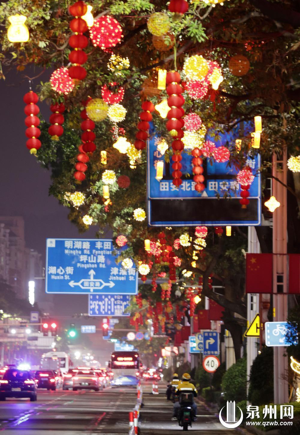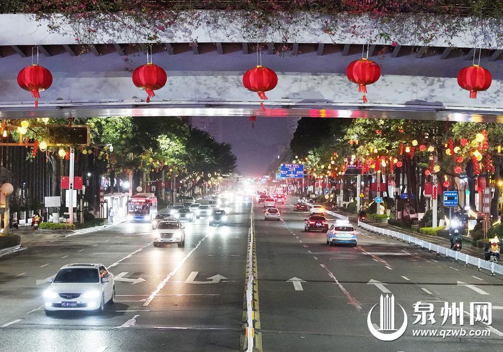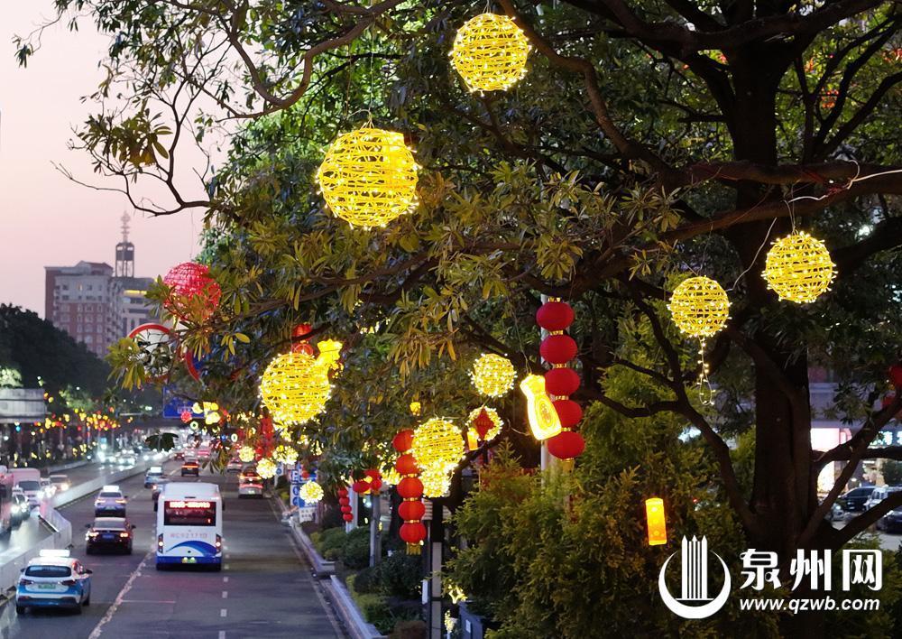春节临近,泉州市区街头彩灯高挂、流光溢彩,年味满溢街巷。