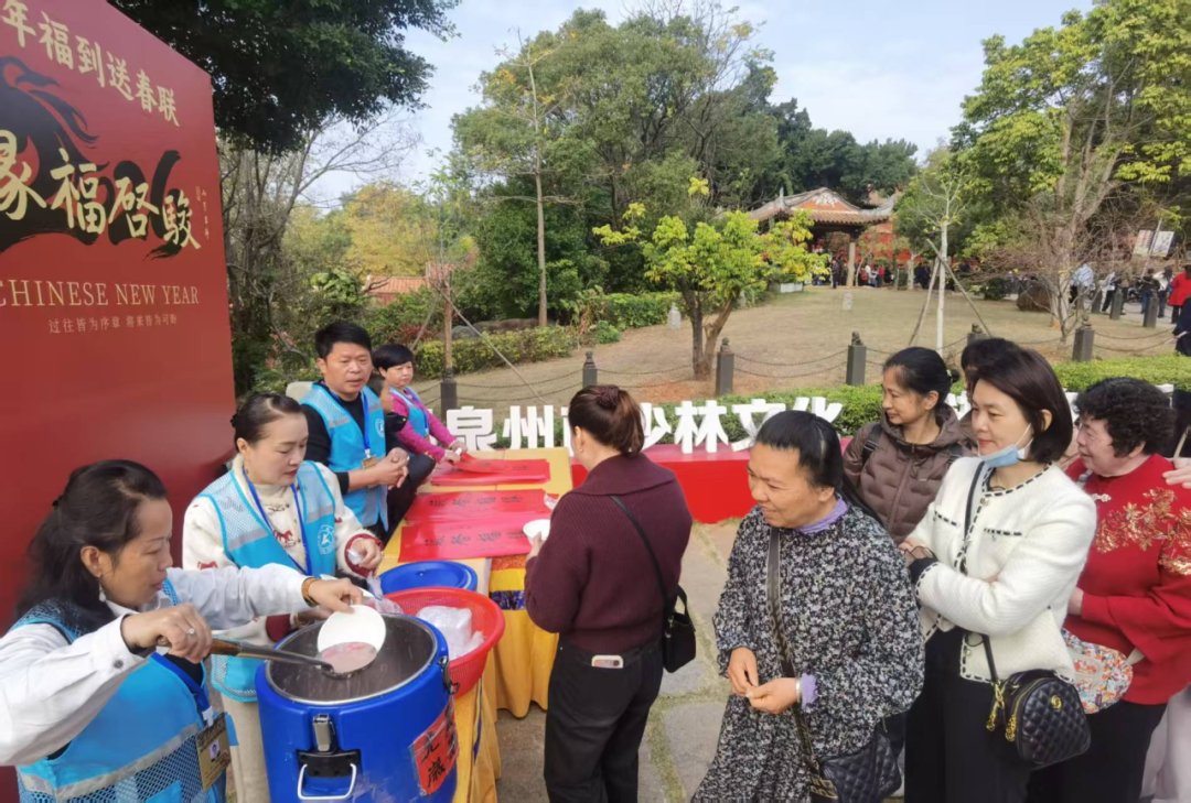在泉州少林寺,武僧们的精彩表演引得阵阵喝彩,而在表演场外,公益讲解员也忙碌不停,协助分发春联、赠粥送暖,用生动的语言为游客讲述南少林禅武文化的源远流长,让游客在感受功夫魅力的同时,更深入理解其背后的文化根脉。
