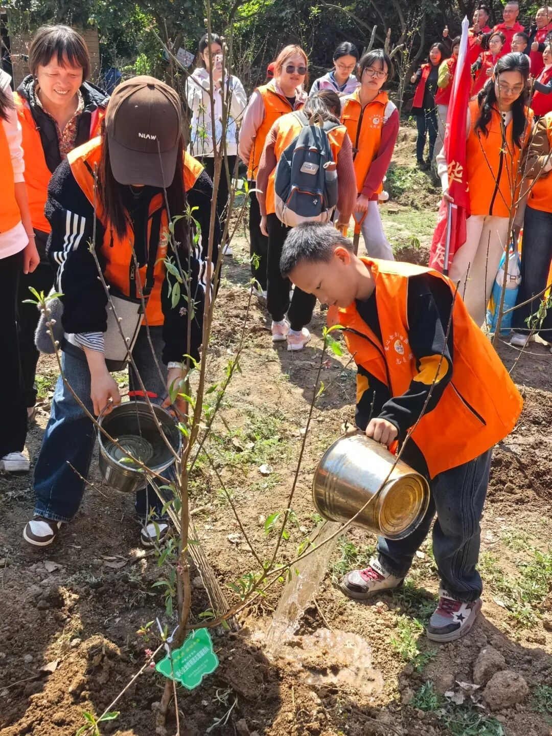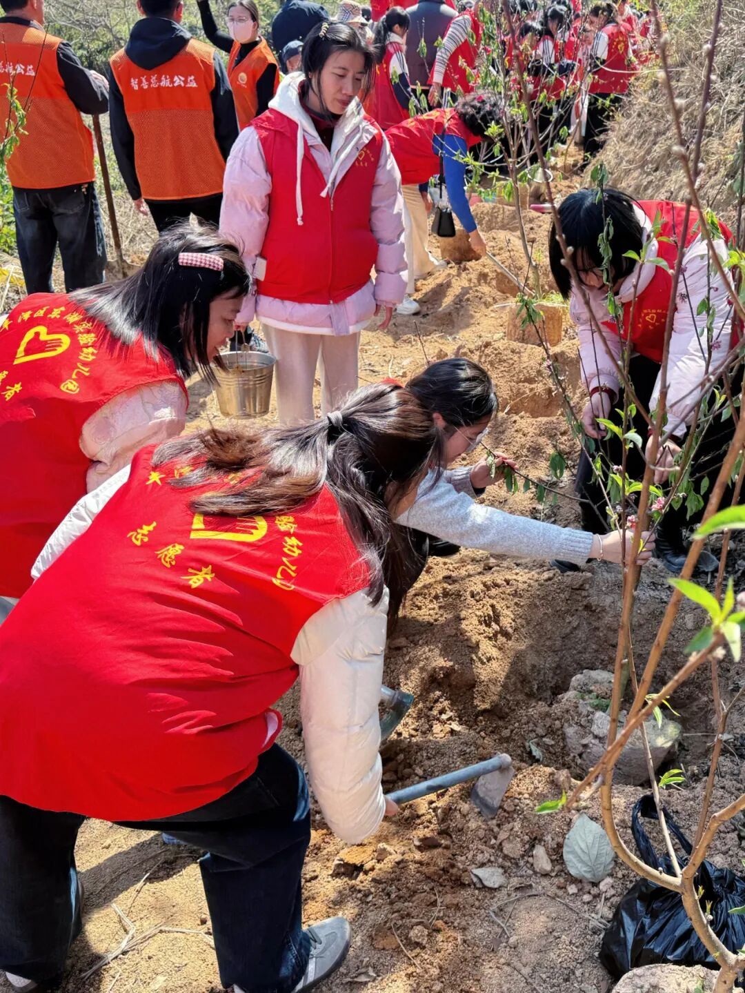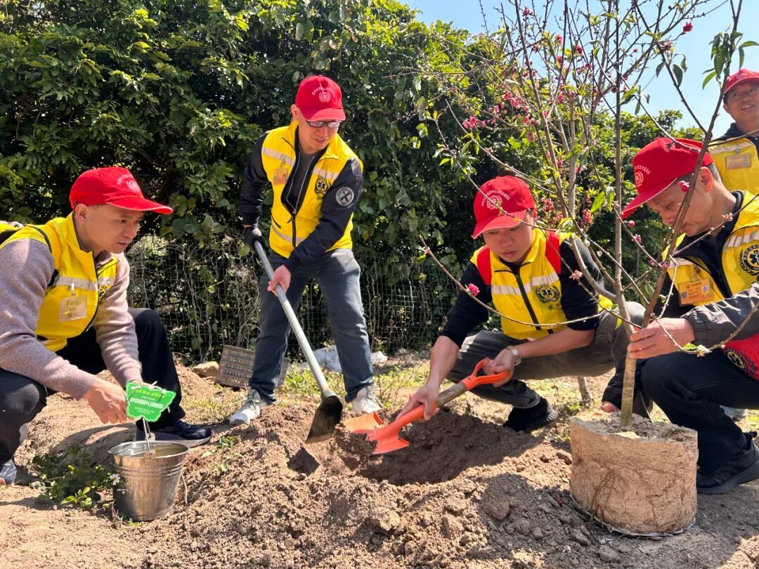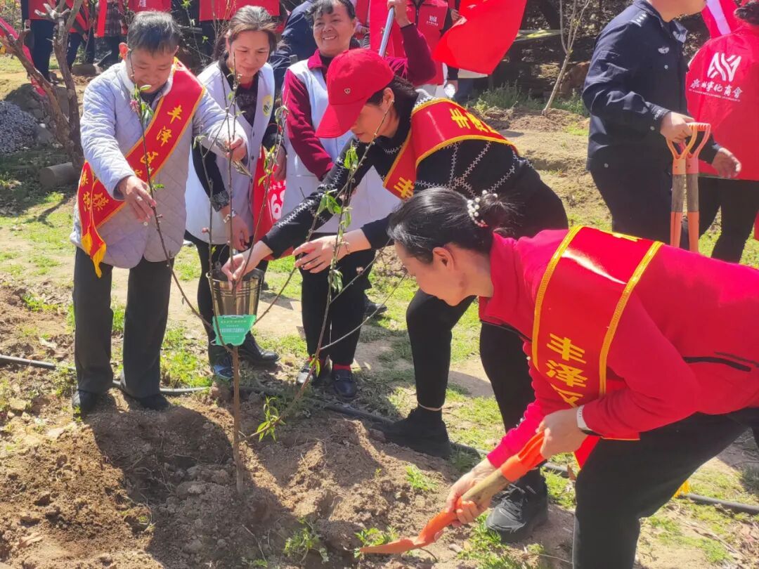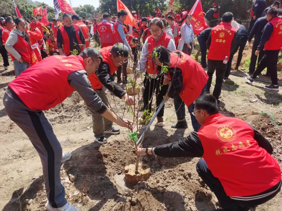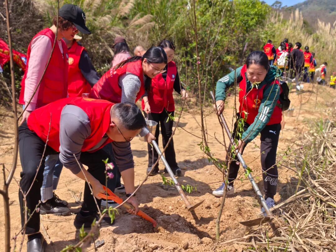 随后,来自泉州市宁德商会志愿服务队的代表柳春华宣读了环保倡议书,呼吁大家从自身做起,践行绿色生活方式,守护我们的绿水青山。“绿色发展,人人有责。希望大家以雷锋精神为指引,用实际行动为丰泽增绿添彩,带动更多人加入植树护林的行列。”丰泽区委社会工作部相关负责人登台致辞表示。 挥锹铲土种桃树 志愿红里添新绿