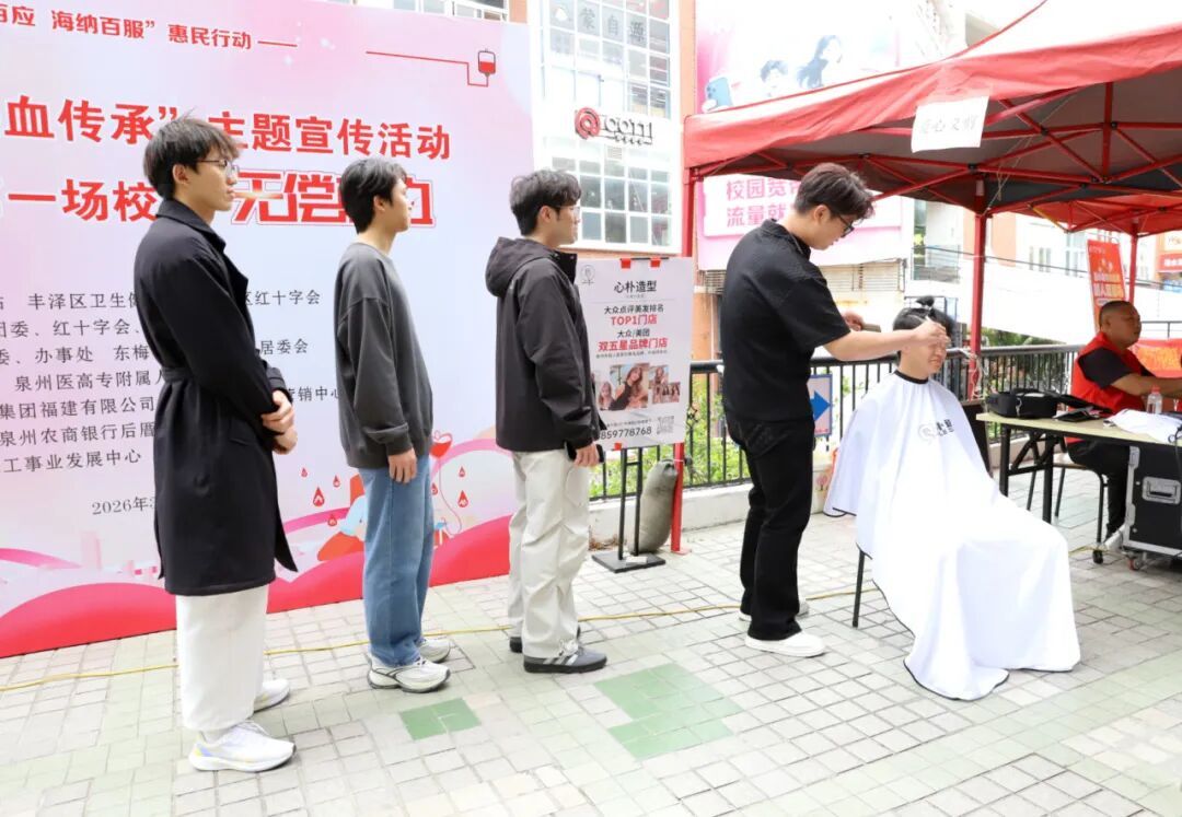现场还围绕婚育政策科普方面,布置新型婚育宣传区,创新设置投壶、石膏娃娃彩绘等趣味互动,将科学婚育、优生优育等理念融入游戏中,引导青年学生树立健康文明的婚育观。 多元服务暖人心 便民惠民零距离 活动现场还同步提供“爱心义剪”“证件拍摄”“茶点补给”等4项惠民服务,推动雷锋精神落地见效:来自心朴造型的志愿者耐心为师生修剪发型,清爽的形象赢得连连点赞;东梅社区与泉州农商银行后厝支行共同组织的免费证件照拍摄,将一张张青春笑脸定格下来;茶点补给站则为献血或参与活动的师生准备糕点、水果和饮品,让大家在奉献爱心的同时感受到浓浓的关怀。